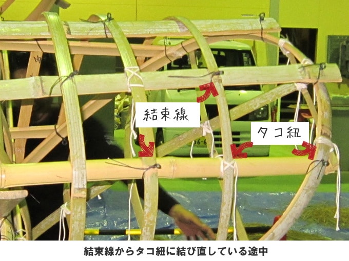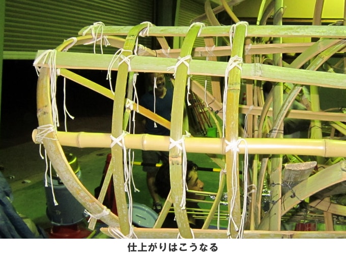 このとき竹と竹を結ぶのにはタコ紐を使っています。骨組みの写真でいたるところに見える白い紐です。