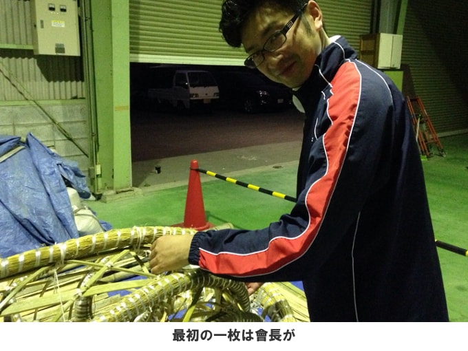 一枚目は内田會長が貼って、後はみんなで作業開始。
